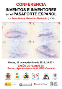Tratará sobre los inventos e inventores españoles más importantes y que están representados en las hojas del pasaporte español. Tendrá lugar en el salón de plenos del Ayuntamiento el martes 19 de septiembre a las 20:30 horas.