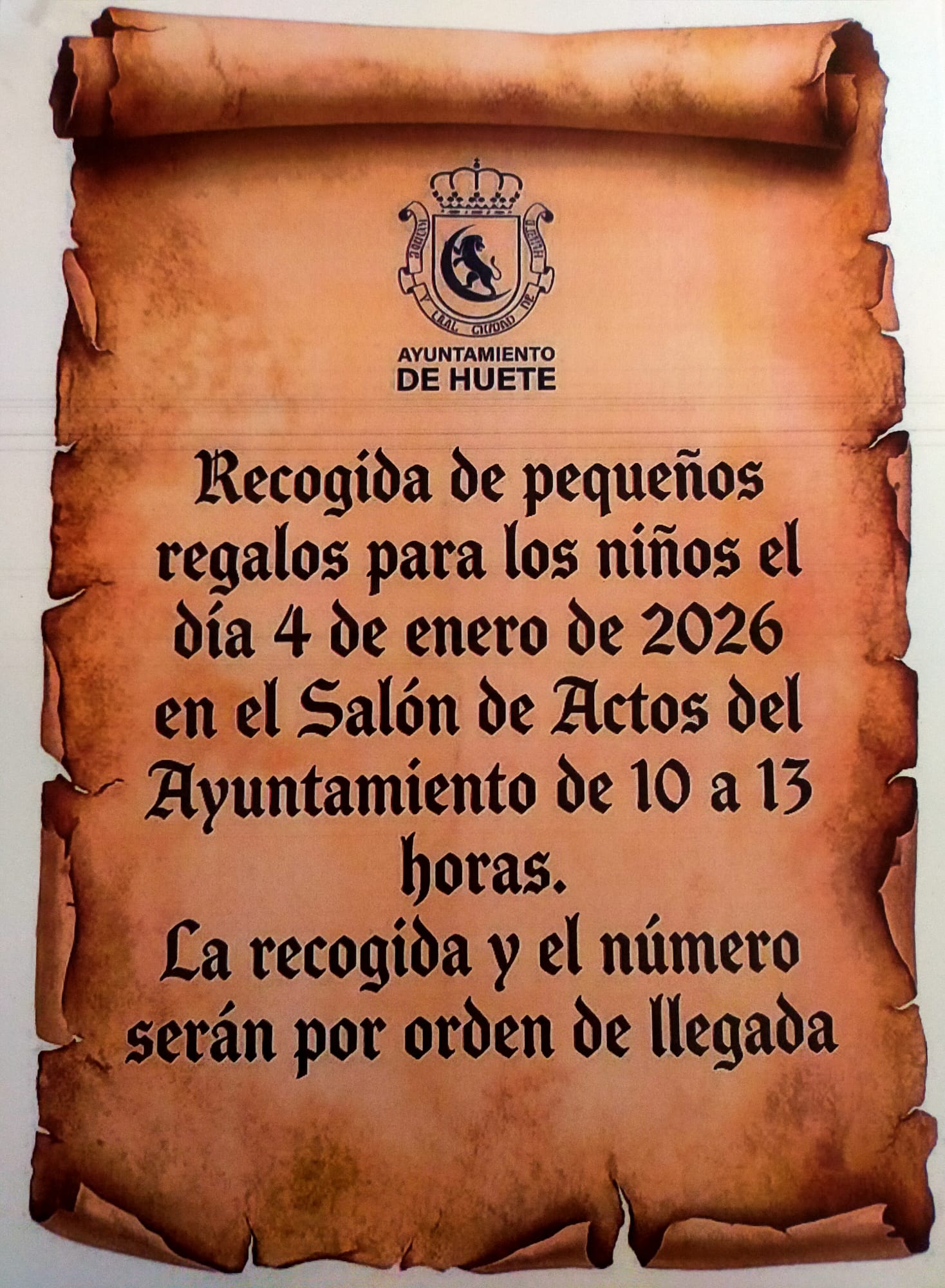RECOGIDA DE REGALOS: Informamos que el próximo 4 de enero, de 10:00h a 13:00h., tendrá lugar la recogida de regalos en el Salón de Actos del Ayuntamiento.