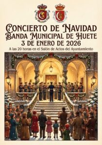 El día 3 de enero, a las 20:00h, en el Salón de Actos del Ayuntamiento, tendrá lugar el Concierto de Navidad, ofrecido por la Banda de Música de Huete.