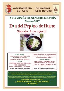 El sábado 5 de agosto, será un día que Huete lo dedica a uno de sus productos con más calidad, el Pepino de Huete. Un día lleno de actividades: se celebrará, como ya es tradicional, un Mercadillo dedicado preferentemente al Pepino de Huete, en el que también se comercializarán otros cultivos de sus huertas. También, se celebrará un concurso de recetas gastronómicas en el que el Pepino de Huete sea el principal ingrediente.