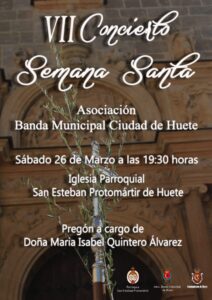 Informamos que este sábado 26 de marzo a las 19:30 horas tendrá lugar en la Iglesia Parroquial San Esteban Protomártir de Huete el pregón de la Semana Santa a cargo de Dª. María Isabel Quintero Álvarez, y el concierto de Semana Santa a cargo de la Banda Municipal Ciudad de Huete.