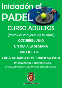 Está destinado a personas mayores de 16 años, se impartirá un día a la semana (una hora) en la pista municipal de pádel, y tendrá una duración de octubre a junio. El precio será de 15 euros para todo el curso y cada alumno deberá traer su pala.