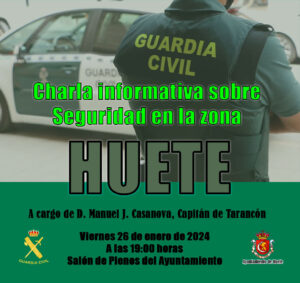 La charla será impartida por el Capitán de la Compañía de la Guardia Civil de Tarancón y tendrá lugar el viernes 26 de enero a las 19:00 horas en el Salón de Plenos del Ayuntamiento de Huete.
