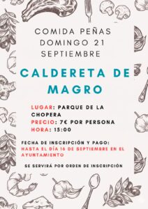FESTEJOS TABLÓN DE ANUNCIOS Comida de Peñas 2025 Ayuntamiento de Huete 9 septiembre 2025 🎉 COMIDA DE PEÑAS 🎉 🗓️ DOMINGO 21 🕒 15:00 H. 🍲 CALDERETA DE CERDO ¡No te lo pierdas, buena comida y mejor compañía! ¡Os esperamos! Navegación de entradas Anterior: Juegos Populares e hinchables en el Parque de la ChoperaSiguiente: GYMKHANA para peñas el domingo de la Merced Historias relacionadas CULTURA TABLÓN DE ANUNCIOS TURISMO Inauguración de 5 nuevas exposiciones en los museos de fotografía y arte contemporáneo Ayuntamiento de Huete 20 octubre 2025 FESTEJOS SERVICIOS SOCIALES, INFANCIA Y MUJER Huete celebra el Día de la Mujer Rural con varias actividades Ayuntamiento de Huete 17 octubre 2025 DEPORTES Y JUVENTUD SERVICIOS SOCIALES, INFANCIA Y MUJER TABLÓN DE ANUNCIOS VII Marcha Solidaria el domingo 19 de octubre en Huete Ayuntamiento de Huete 14 octubre 2025