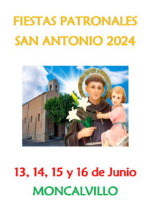 El pueblo de Moncalvillo de Huete celebra este fin de semana sus Fiestas Patronales en honor a San Antonio de Padua, del 13 al 16 de junio. Comenzarán las fiestas con el pregón a cargo de D. Ángel Mochales. el viernes a las 22:30 horas en la plaza, con posterior verbena a cargo de la «Orquesta GRUPO VALERA».