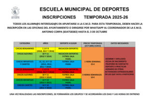 El Ayuntamiento de Huete abre el plazo de inscripción para la Escuela Municipal de Deportes. La temporada abarca octubre–junio y el trámite puede hacerse en las oficinas del Ayuntamiento o por WhatsApp al coordinador Antonio Corpa (654758383) hasta el 3 de octubre.