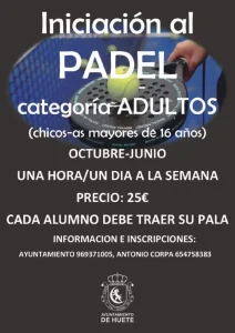 Iniciación al pádel – categoría adultos (chicos/as mayores de 16 años). Periodo octubre–junio · 1 hora / 1 día a la semana · Precio: 25 € · Cada alumno/a debe traer su pala.
