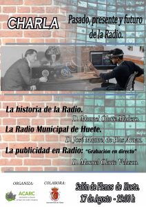 El próximo viernes 17 de agosto a las 19,00 horas (salón de plenos) y organizado por la ACARC (Asoc. Cultural Amigos de Radio Chopera), se impartira un ciclo de conferencias teniendo como tema principal la radio: pasado, presente y futuro de la radio. El primer ponente (Manuel Olarte Madero) hará una reseña sobre la historia de la radio en España desde sus comienzos hasta hoy (HISTORIA DE LA RADIO), incluye audios históricos, anuncios radiofónicos, etc. El segundo ponente (José Manuel de Blas) dará explicaciones sobre la nueva radio municipal de Huete (LA RADIO MUNICIPAL DE HUETE), su estructura y la mejor forma de participar en ella y sintonizarla. Por último un tercer ponente (Manuel Olarte Velasco) imapartirá su charla sobre la publicidad en la radio (PUBLICIDAD EN LA RADIO) donde explicará la financiación de las emisoras y realizará una cuña publicitaria en la propia sala de la charla.