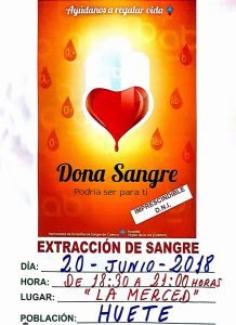 Informamos que el próximo miércoles 20 de junio de 2018 tendrá lugar en el Salón de Actos del Ayuntamiento (teleclub), una jornada de donación de sangre con horario de 18:30 a 21:00 horas, organizada por la Hermandad de Donantes de Sangre de Cuenca. Al igual que en los dos últimos años, el ayuntamiento colabora preparando y cediendo el espacio donde la Hermandad ha decidido realizar la donación, el salón de actos y pasillo del edificio de La Merced, al ser más amplio y accesible.