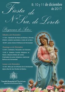 El próximo domingo 10 de diciembre se celebrará la festividad de Ntra. Sra. de Loreto en la Iglesia Real de San Nicolás de Medina. La Solemne Función Religiosa en honor de la titular será a las 13:00 horas, realizándose una cohetada y pasacalles de dulzaina y tambor previamente.