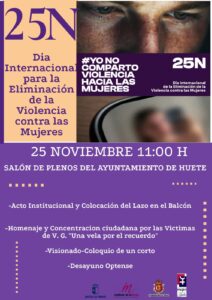 El Ayuntamiento de Huete se suma un año más al 25N, Día Internacional de la Eliminación de la Violencia contra las Mujeres, con una programación de actos que tendrán lugar el próximo 25 de noviembre, a las 11:00 horas, en el Salón de Plenos municipal.