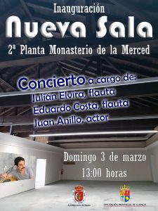 El próximo domingo 3 de marzo a las 13:00 horas tendrá lugar la inauguración de la recuperación de la cubierta y 2ª planta del antiguo Monasterio de Santa María de la Merced, con un concierto a cargo del músico Julián Elvira, flauta, con Eduardo Costa, flauta, y Juan Anillo, actor. En la inauguración intervendrán el alcalde de Huete, Fernando Romero, y el presidente de la Diputación Provincial de Cuenca, Benjamín Prieto.