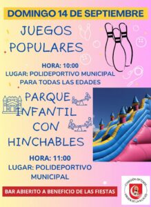 DEPORTES Y JUVENTUD FESTEJOS INFORMACIÓN AL CIUDADANO TABLÓN DE ANUNCIOS Juegos Populares e hinchables en el Parque de la Chopera Ayuntamiento de Huete 9 septiembre 2025 ¡Diversión para toda la familia! El domingo 14 de septiembre, en el Parque de la Chopera, a partir de las 11:00 h, os esperamos para disfrutar de una divertida mañana con Juegos Populares para todas las edades e hinchables para los más pequeños. Navegación de entradas Anterior: Donación de sangre en Huete el 11 de septiembre de 2025 en el AyuntamientoSiguiente: Comida de Peñas 2025 Historias relacionadas DEPORTES Y JUVENTUD TABLÓN DE ANUNCIOS Homenajes a José Ramón Cantero y Julián Usano Ayuntamiento de Huete 30 noviembre 2025 0 FESTEJOS TABLÓN DE ANUNCIOS Huete da la bienvenida a la Navidad Ayuntamiento de Huete 30 noviembre 2025 0 CULTURA FESTEJOS TABLÓN DE ANUNCIOS Exposición de dibujos navideños para los niños Ayuntamiento de Huete 26 noviembre 2025 0