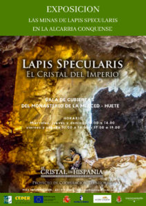 La exposición temporal ‘El Cristal de Hispania’, que se exhibe desde el 24 de abril en la nueva Sala de Cubiertas del Monasterio de la Merced en Huete (2ª planta), ha sido cedida por CEDER Alcarria Conquense al Ayuntamiento de Huete, y supone un gran complemento a las visitas a las Minas de Lapis Specularis la Cueva del Sanabrio, de Saceda del Río, e incrementa el interés del público por el patrimonio romano del lapis specularis en el municipio.