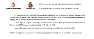 Informamos que la Parroquia de San Esteban Protomártir y el Ayuntamiento de Huete invitan a la Solemne Función Religiosa que se celebrará el próximo domingo 19 de julio en honor a Santas Justa y Rufina, patronas históricas de Huete, misa que será dedicada en memoria y sufragio por las víctimas mortales de la pandemia del coronavirus.