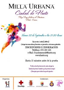 Un año más las Fiestas de La Merced de Huete acogerá la prueba de atletismo Milla Urbana Ciudad de Huete. Tendrá lugar el viernes 22 de septiembre a las 21:30 horas. Las inscripciones se podrán realizar por email a frandomenech@huete.org, por teléfono o en la misma plaza Fray Ambrosio Montesino (lugar de salida) hasta 15 minuntos antes del comienzo de la prueba. Habrá pruebas para categorías inferiores antes de disputarse la Milla Urbana.