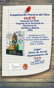 El Ayuntamiento de Huete invita a vecinos y visitantes a la presentación literaria del libro “Huete. Ponencias del XXII Congreso de la Asociación de Escritores de Castilla-La Mancha 2025”, una obra que recoge las intervenciones de escritores y conferenciantes disertadas en nuestra ciudad dentro de este importante encuentro cultural que tuvo lugar el pasado 25 de octubre de 2025.