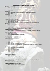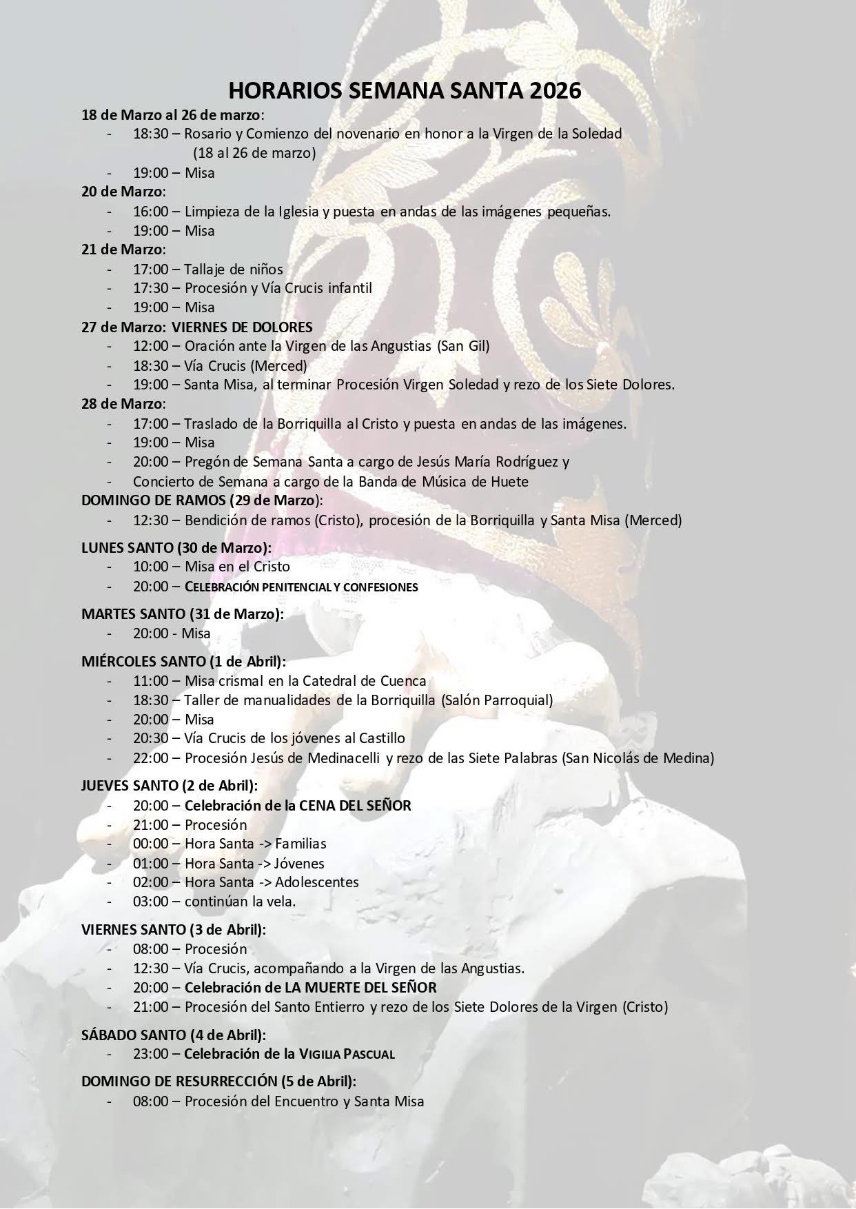 En esta entrada publicamos el cartel de la Semana Santa de Huete y la programación para este año 2026 para información de todos los optenses y visitantes. Programación que nos ha facilitado la Parroquia San Esteban Protomártir que es la organizadora de los eventos religiosos junto con las hermandades de Huete, y la colaboración del Ayuntamiento.