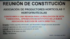 Una vez celebrada una primera reunión informativa, se convoca a reunión de constitución de la nueva Asociación de Productores Hortícolas y Hortofrutícolas de la Comarca, para la realización del acta fundacional, aprobación de estatutos, elección de Junta Directiva, etc.
