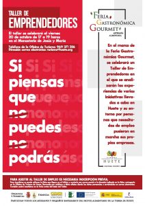 En el marco de la Feria Gastronómica Gourmet de la Tierra de Huete, se celebrará un Taller de Emprendedores en el que se analizarán las experiencias de varias iniciativas llevadas a cabo en Huete y su entorn opor personas que necesitadas de empleo pusieron en marcha sus propias empresas.