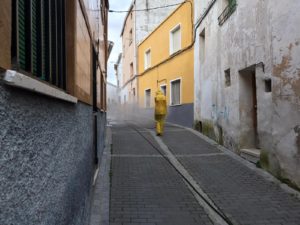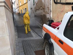 En esos tres días (miércoles, jueves y viernes) se han desinfectado prácticamente la totalidad de calles de Huete, y también de los pueblos del municipio. También hemos intensificado la desinfección en edificios públicos y elementos que pudieran ser más propensos al contagio, como pomos de puertas, barandillas, contenedores, bancos, etc.