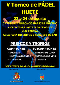 El Ayuntamiento de Huete, a través de su concejalía de deportes, con el fin de fomentar la práctica del pádel y el uso de nuestra pista municipal, organiza el V Torneo de Pádel en Huete, que se celebrará el 23 y 24 de agosto en la pista de pádel municipal.
